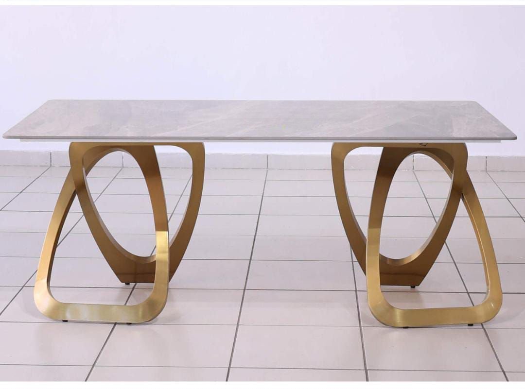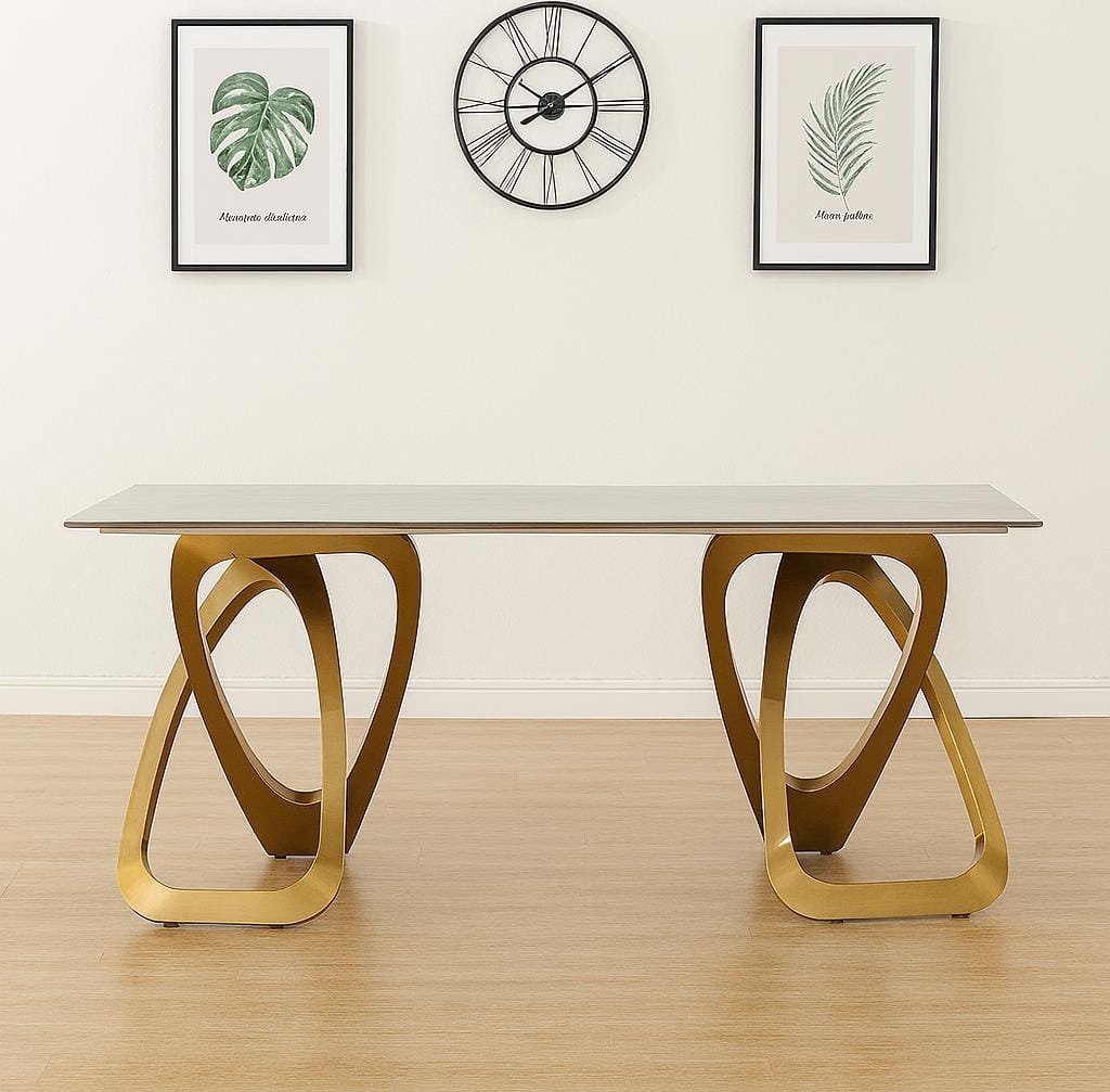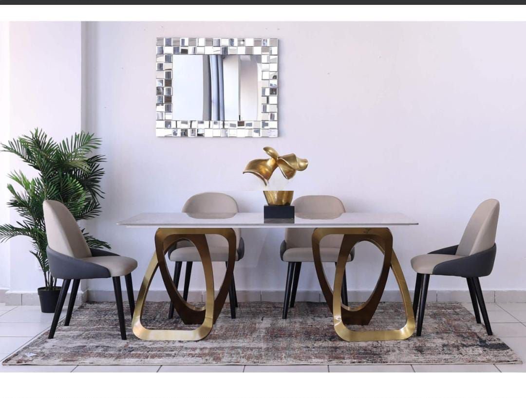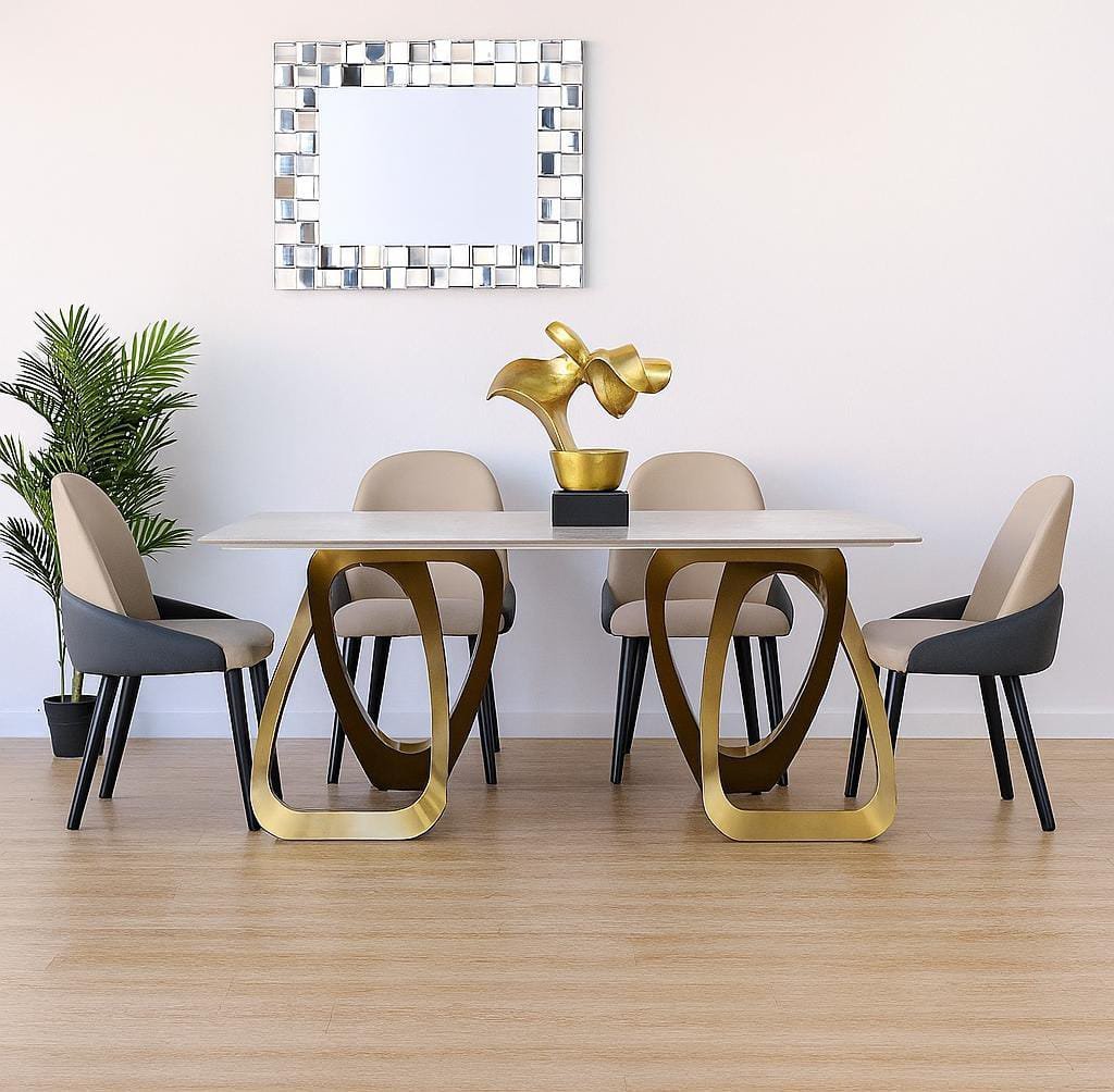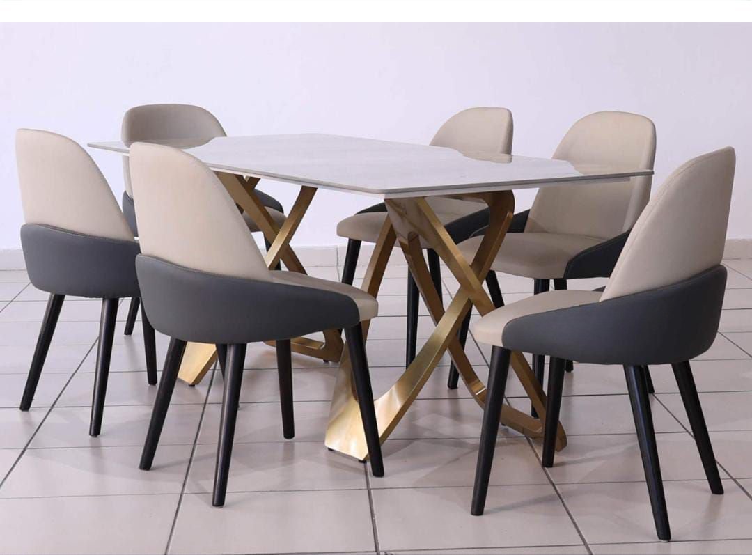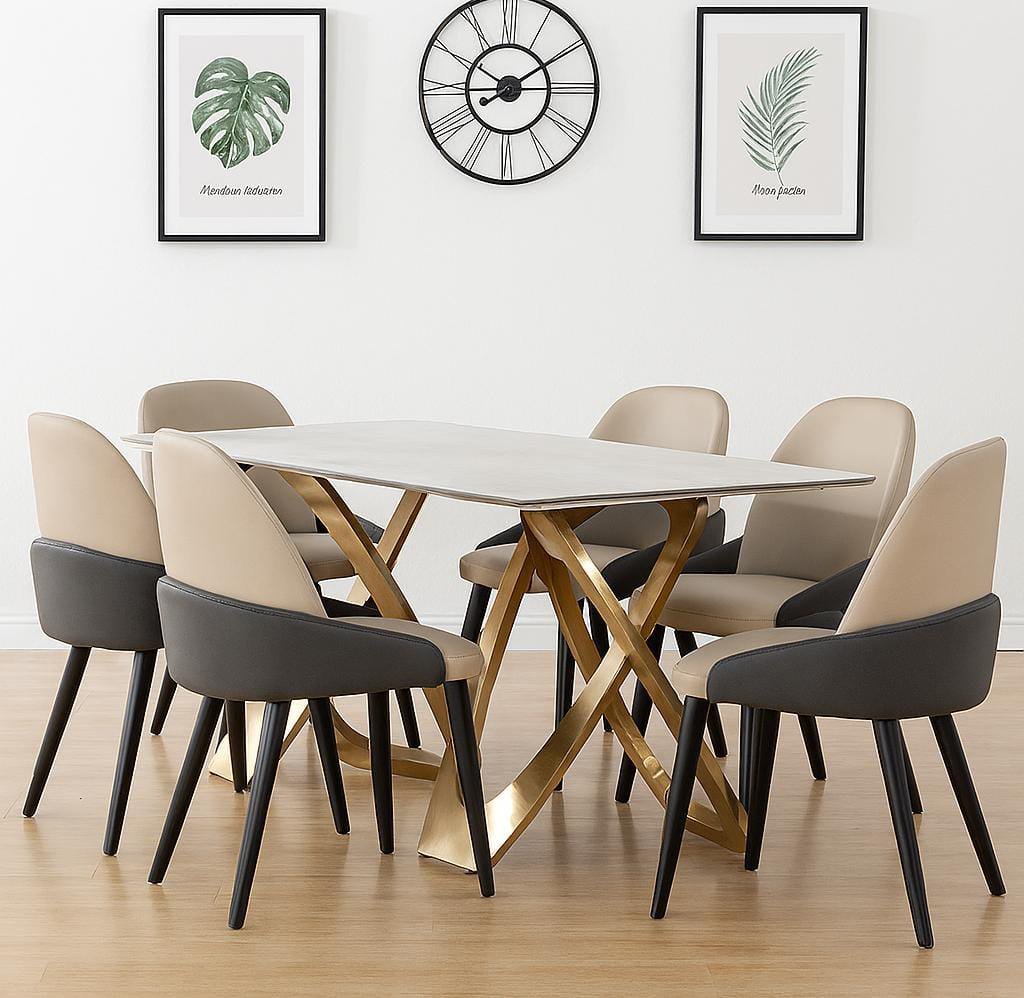 Trio Dining Table + 6 Metz Chairs. Table 180x90x75cm, Chair 58x52x90cm. Sintered stone top, gold steel base, leather seats. Stylish 7pcs modern dining set.