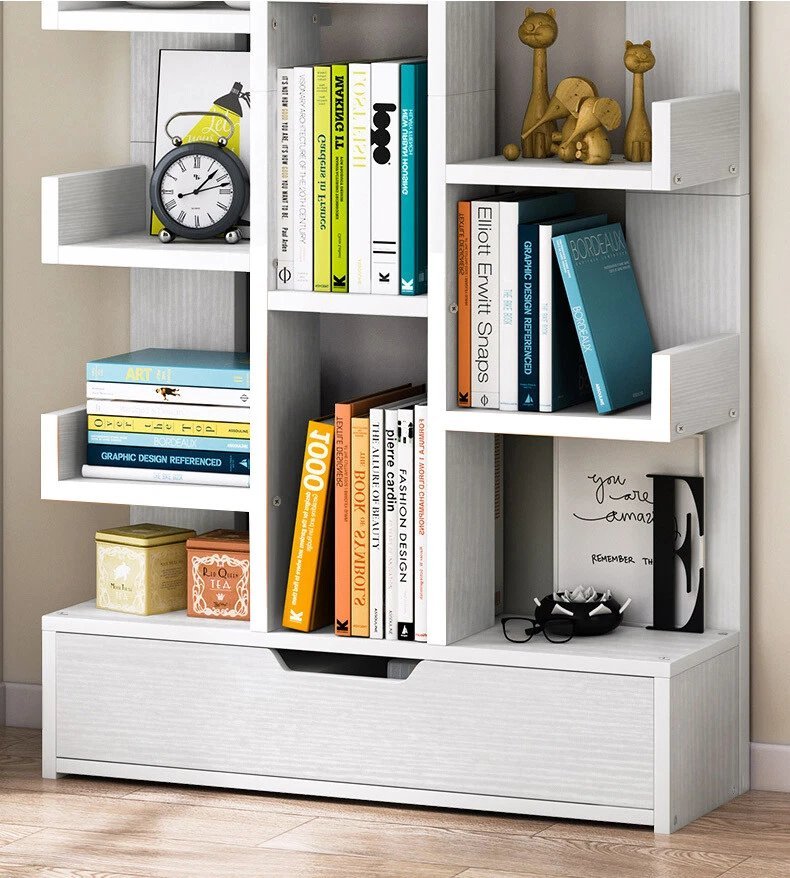 Featuring 17 spacious tiers and a convenient bottom drawer, the Kensley offers ample storage for books of all sizes, photo frames, cherished decorations, and other display items.