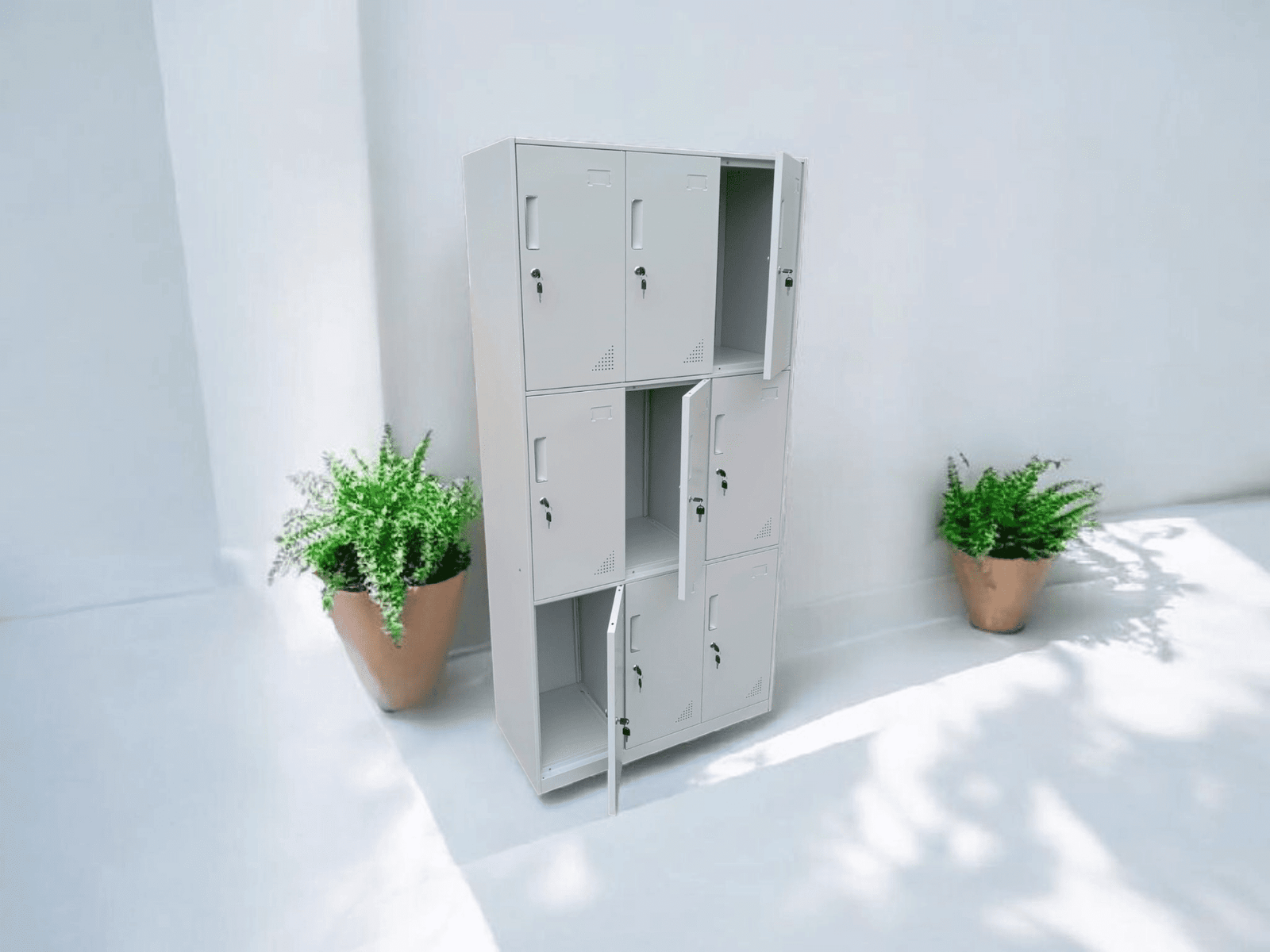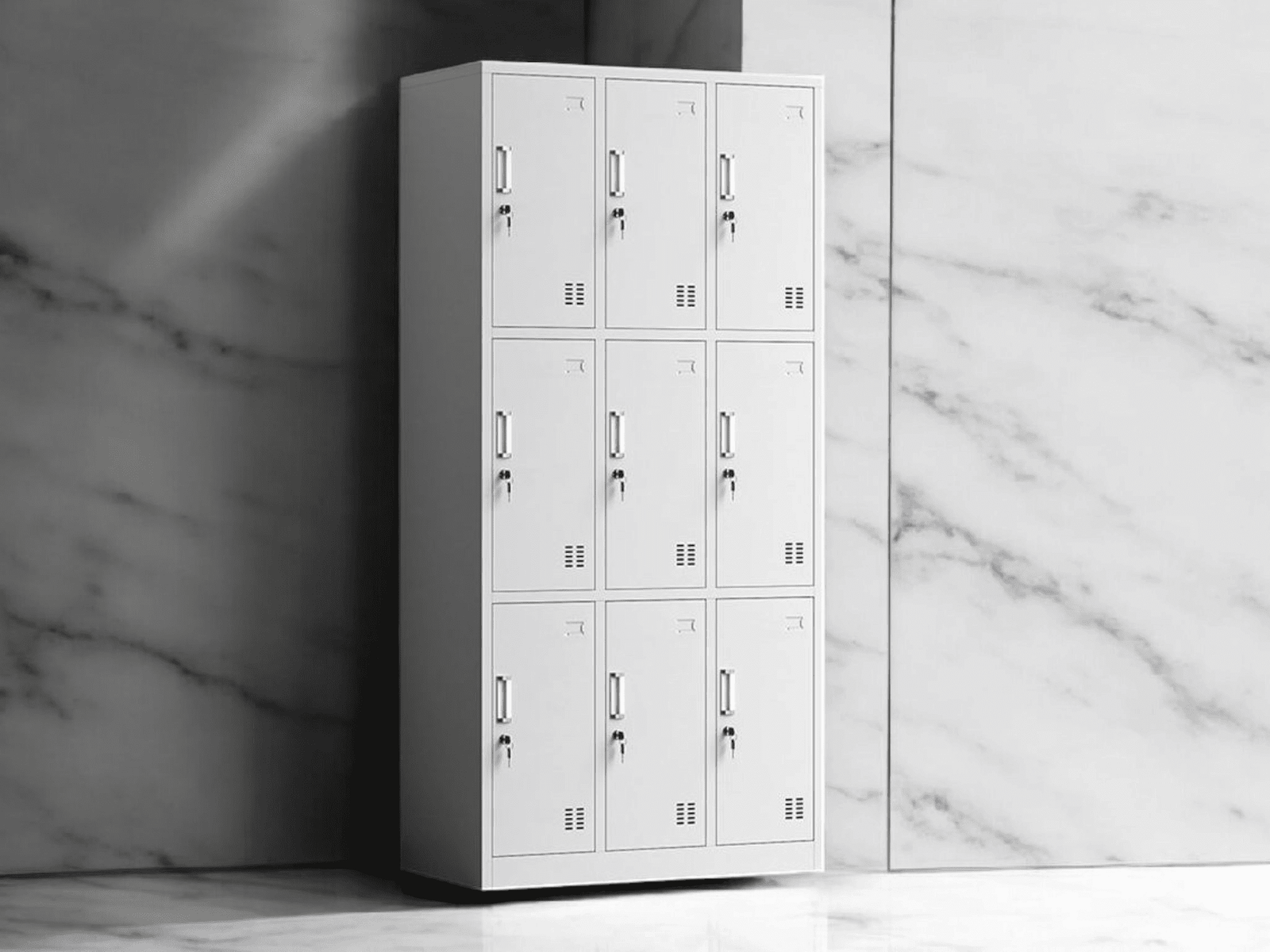 With nine individual compartments, each featuring a lockable door, it’s ideal for organizing and securing items.
