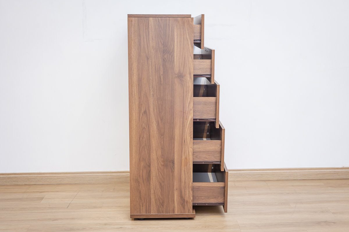 This tall chest of drawers provides ample storage with its smooth-gliding drawers, ideal for organizing clothing, linens, and more.