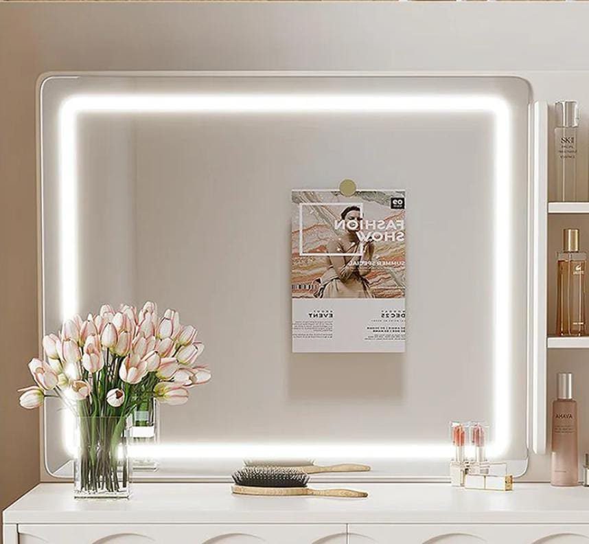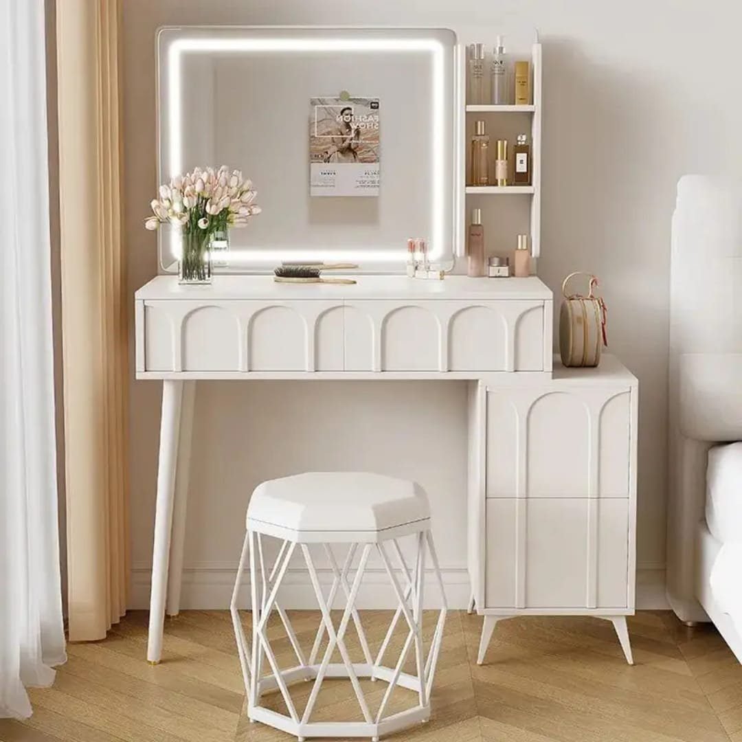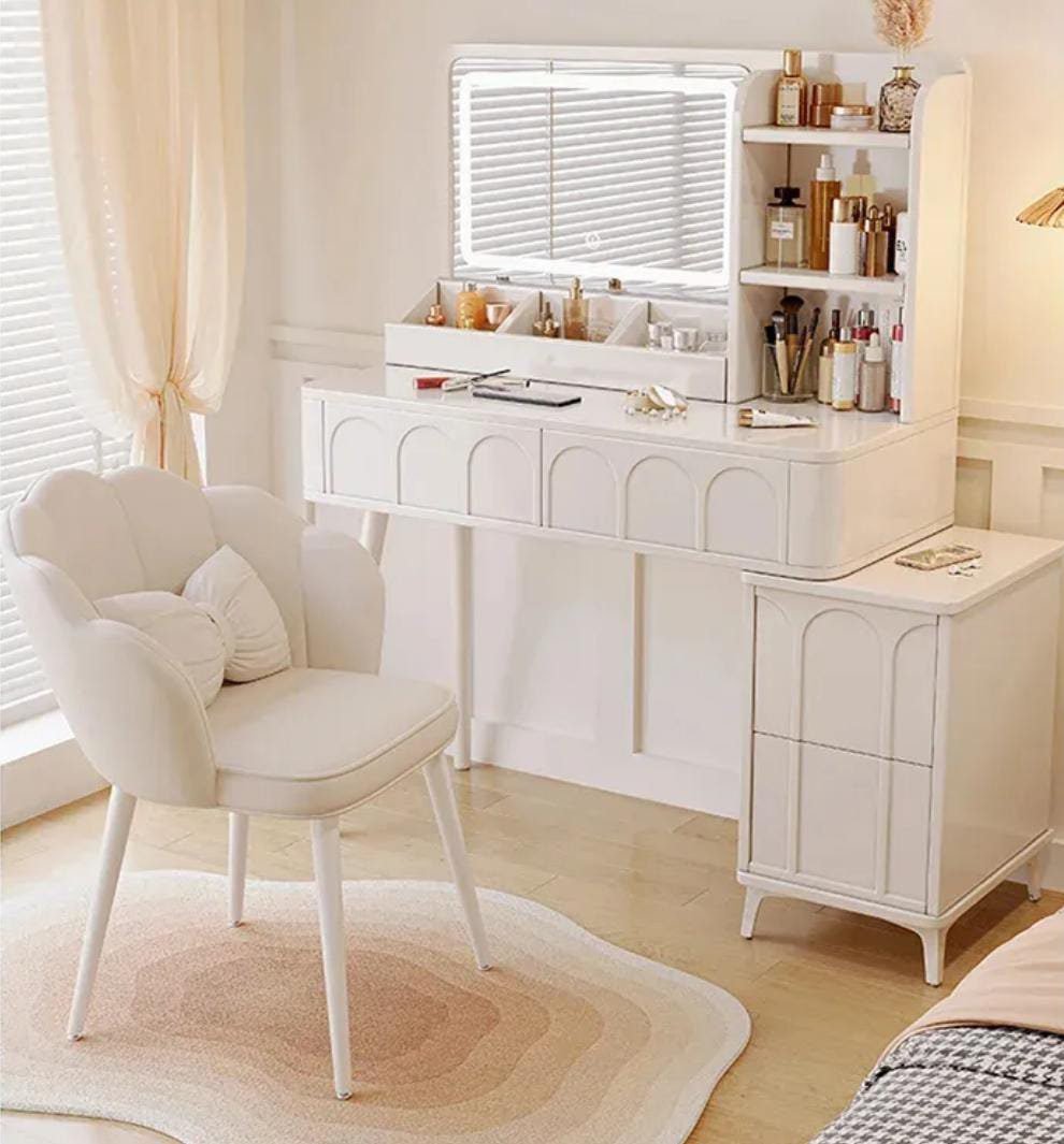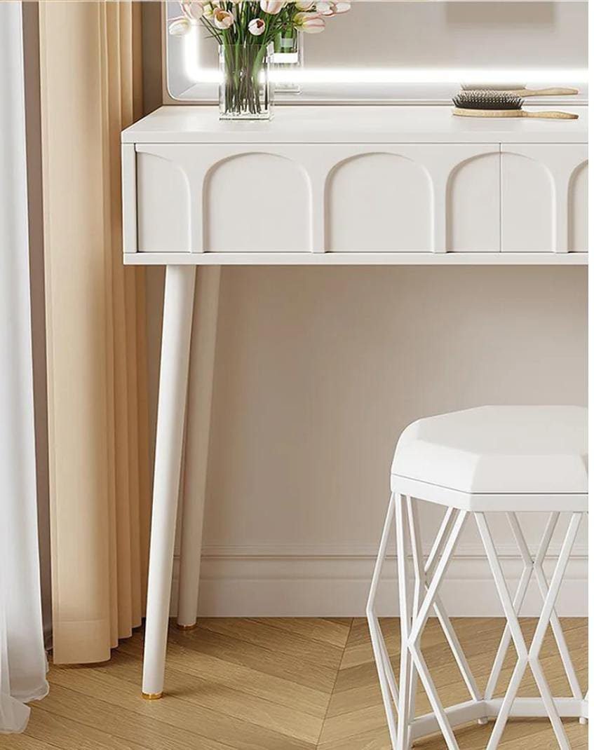 The Imela-Dressing Table with LED Mirror and Chair is equipped with integrated LED lighting, providing bright and even illumination for flawless application. A makeup stool with a comfortable seat and sturdy base is included for convenient use. The dressing table offers plenty of storage with 5 drawers and a cabinet with 3 shelves, keeping your essentials organized and within reach.