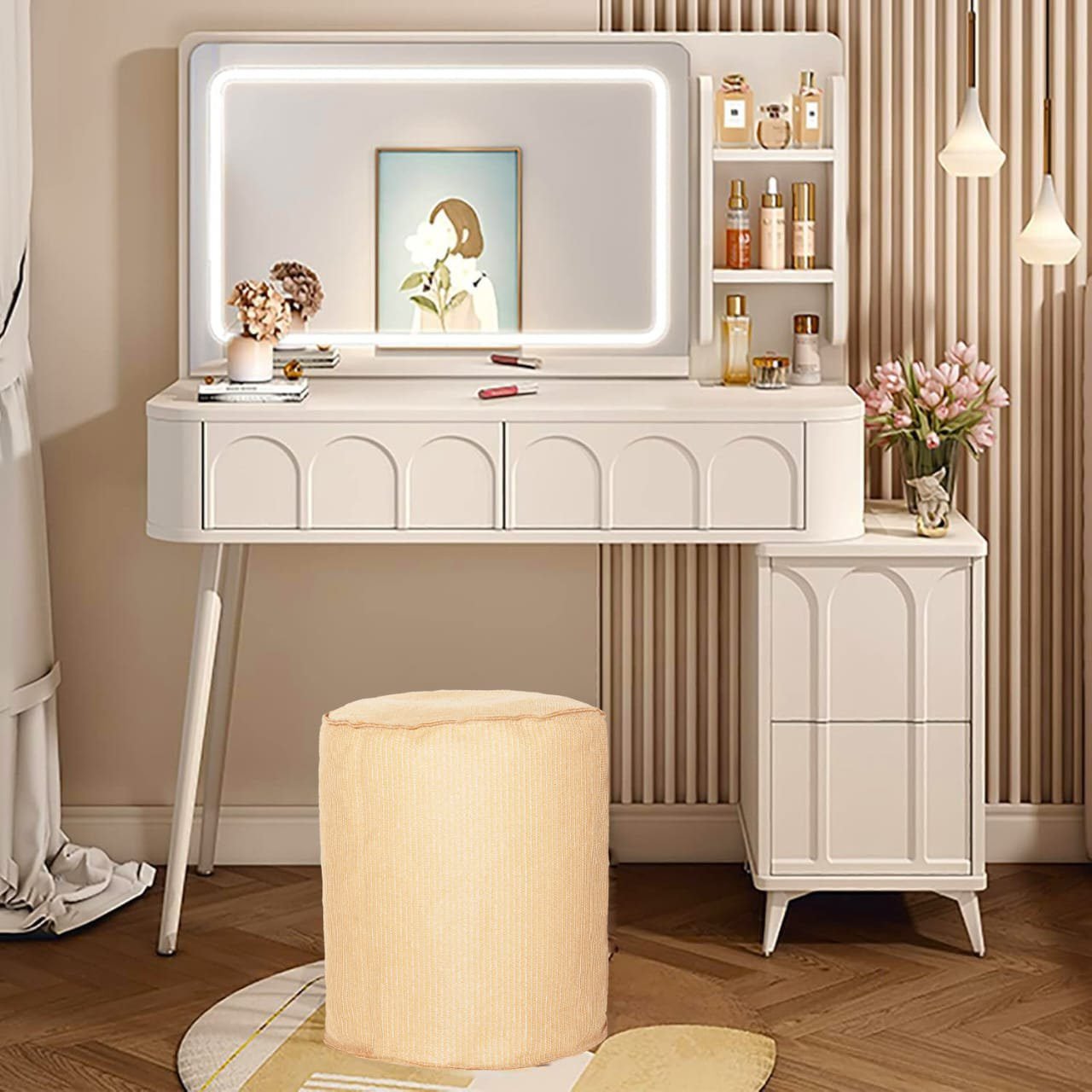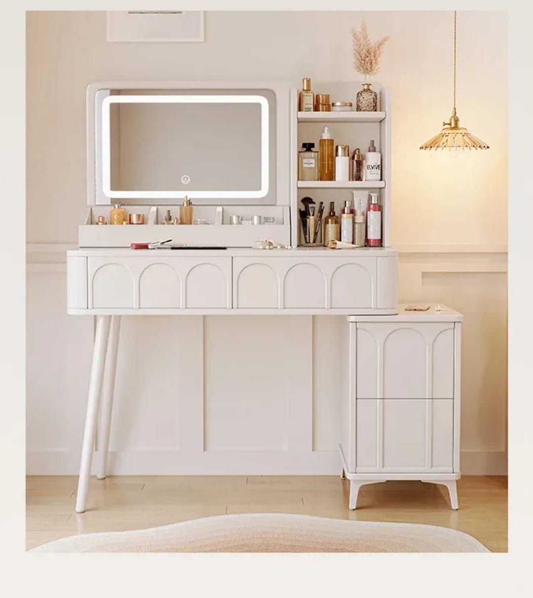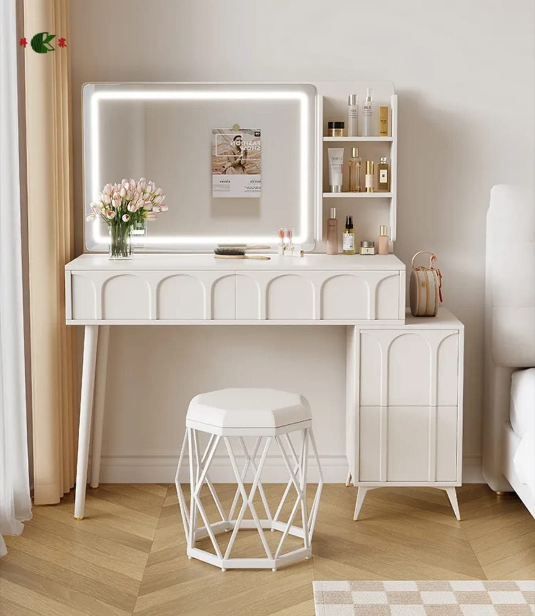 The Imela-Dressing Table with LED Mirror and Chair is equipped with integrated LED lighting, providing bright and even illumination for flawless application. A makeup stool with a comfortable seat and sturdy base is included for convenient use. The dressing table offers plenty of storage with 5 drawers and a cabinet with 3 shelves, keeping your essentials organized and within reach.