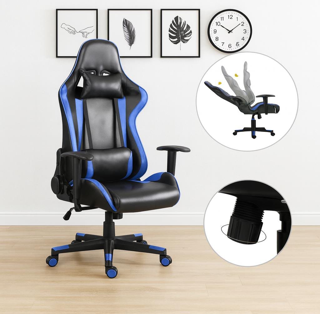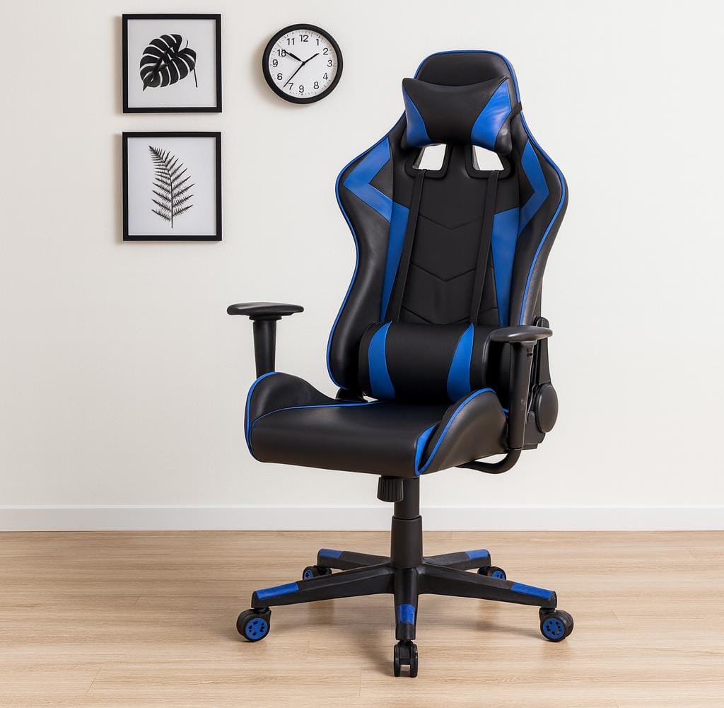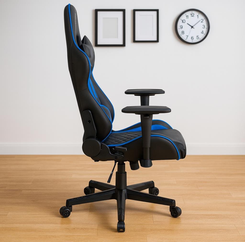 Breed High Back Gaming Chair ; Blue & Black, Metal frame, PU leatherette, 67×64×136cm, 150kg capacity. A premium, powerful ergonomic choice for home or office.