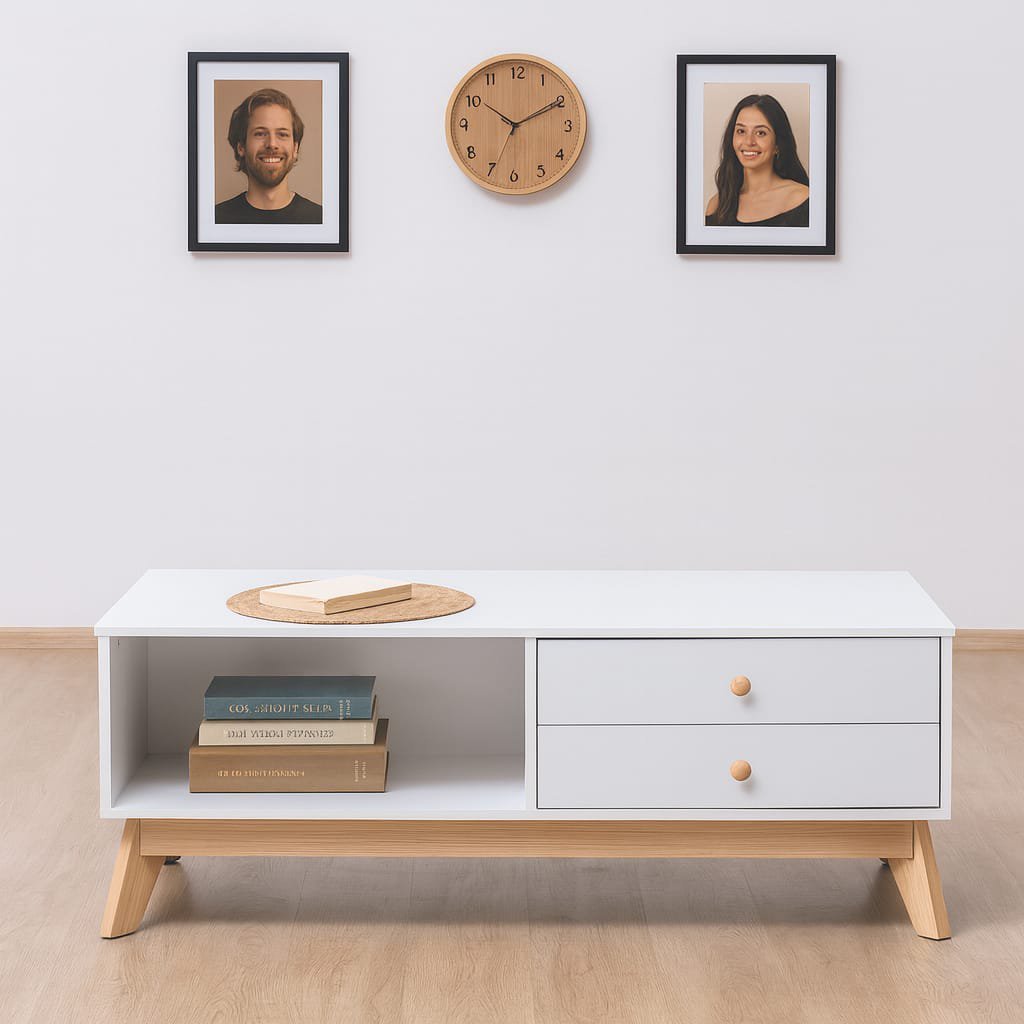 – White MDF laminate, L122×W65×H50cm with 4 soft-close drawers & 2 open shelves. Durable, stylish & functional centerpiece.