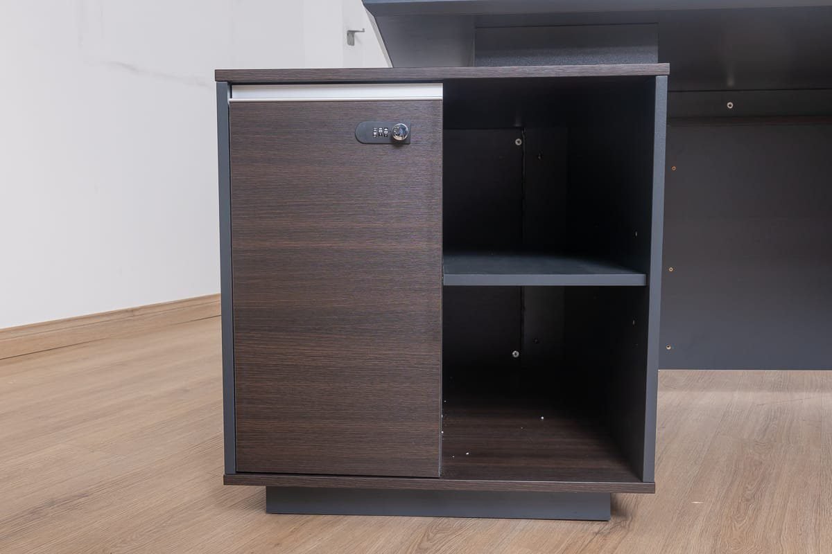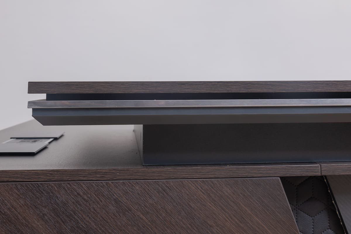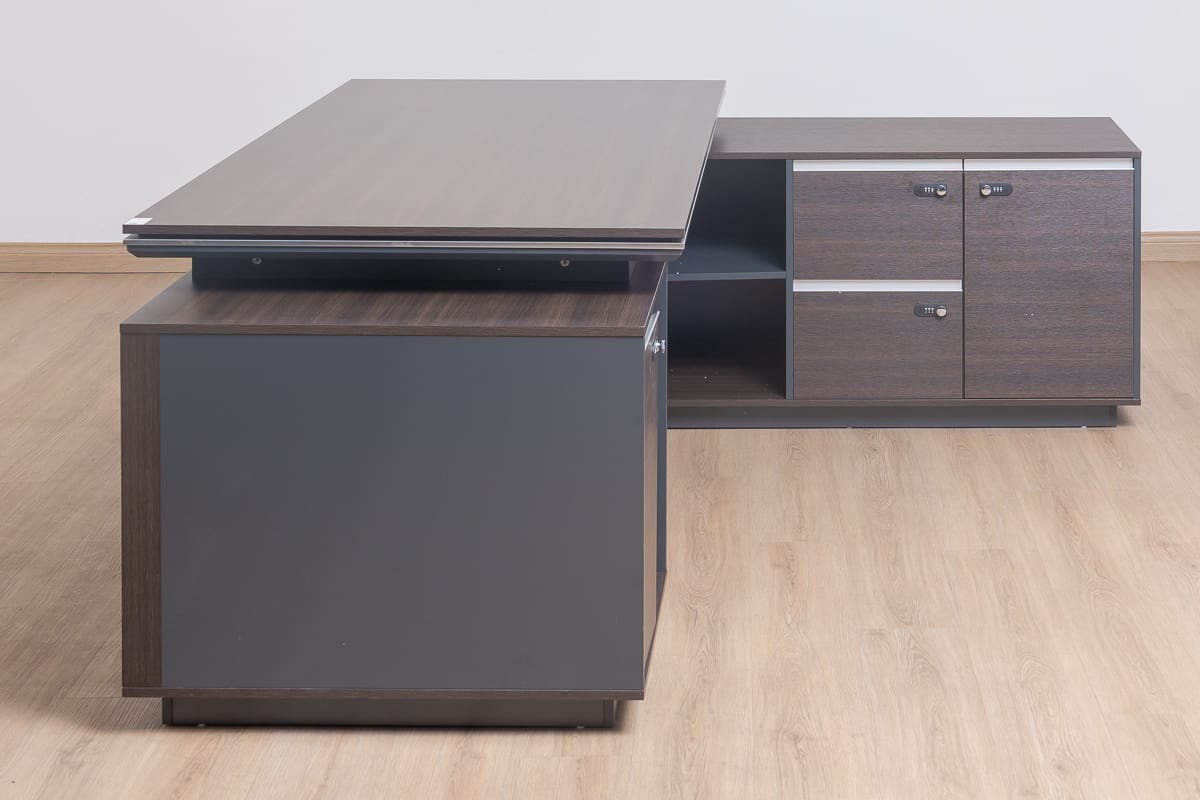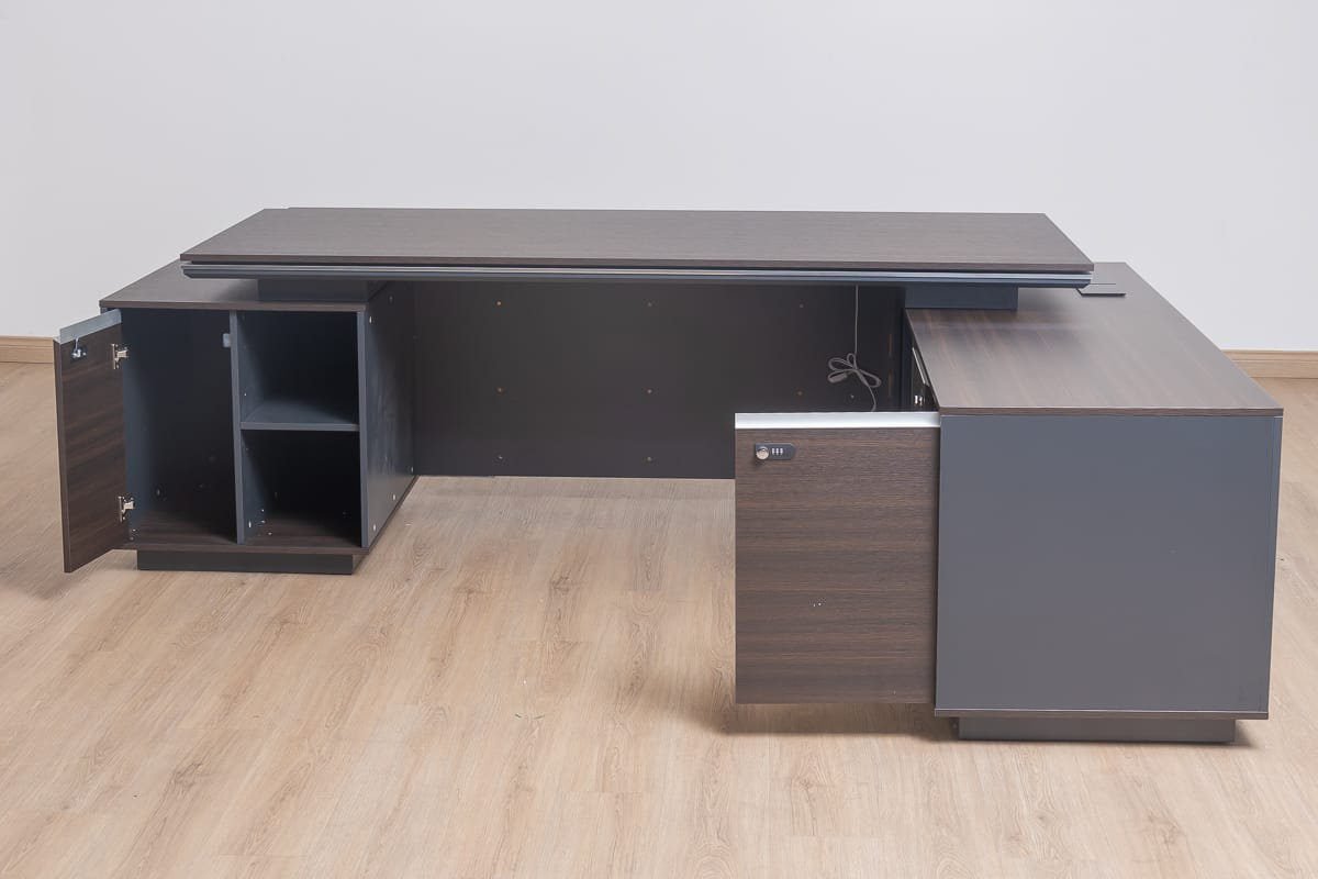 This large and luxurious desk features a sophisticated Ebony Gray finish and a fixed return with drawers for ample storage.