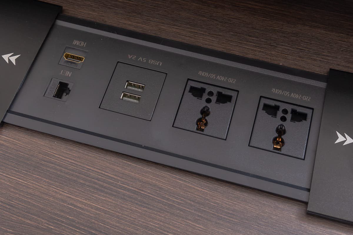 Designed for the modern executive, it includes a built-in power and data socket for seamless connectivity.
