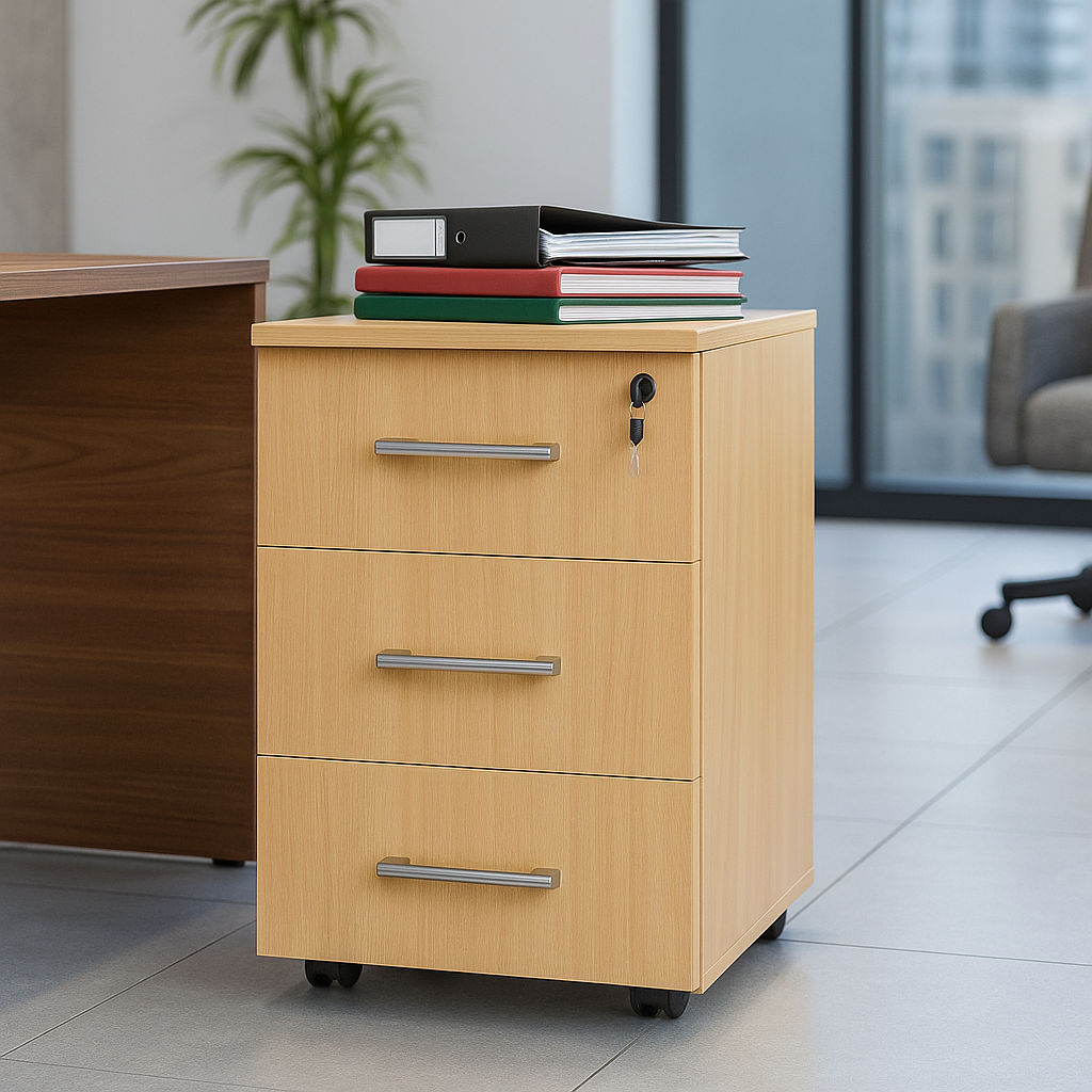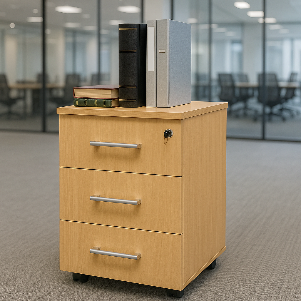 Designed for modern workspaces, it features dual 120x60cm writing desks, a central 120cm partition for privacy, and 2 mobile 3-drawer pedestals with lockable top drawers.